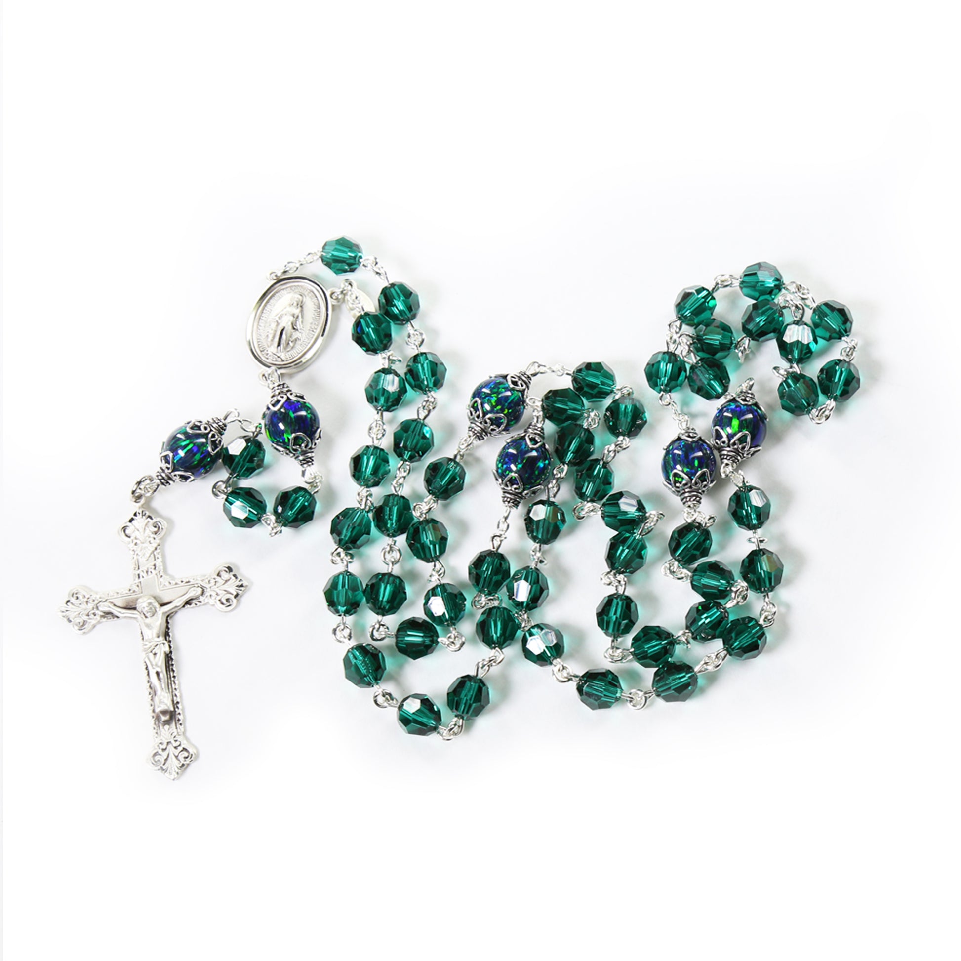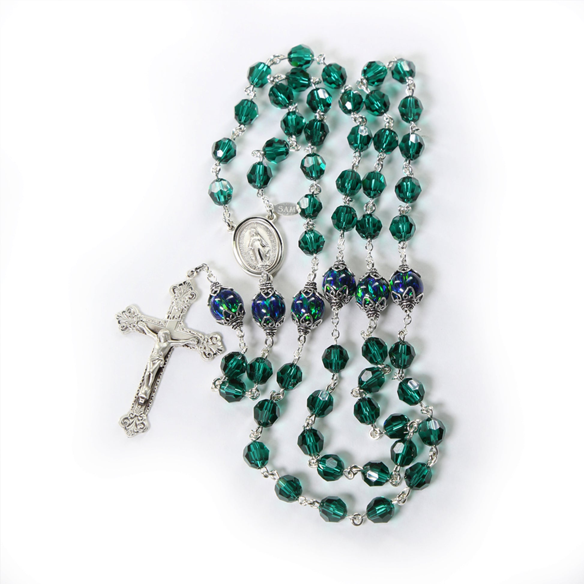 The Hail Marys are 8mm faceted, emerald green Swarovski crystals. Our Fathers are 10mm iridescent Manmade Opals encased with Sterling Silver Bead caps. It carries a Miraculous Medal center and a 2″ Ornate crucifix that may be engraved. SKU# 597