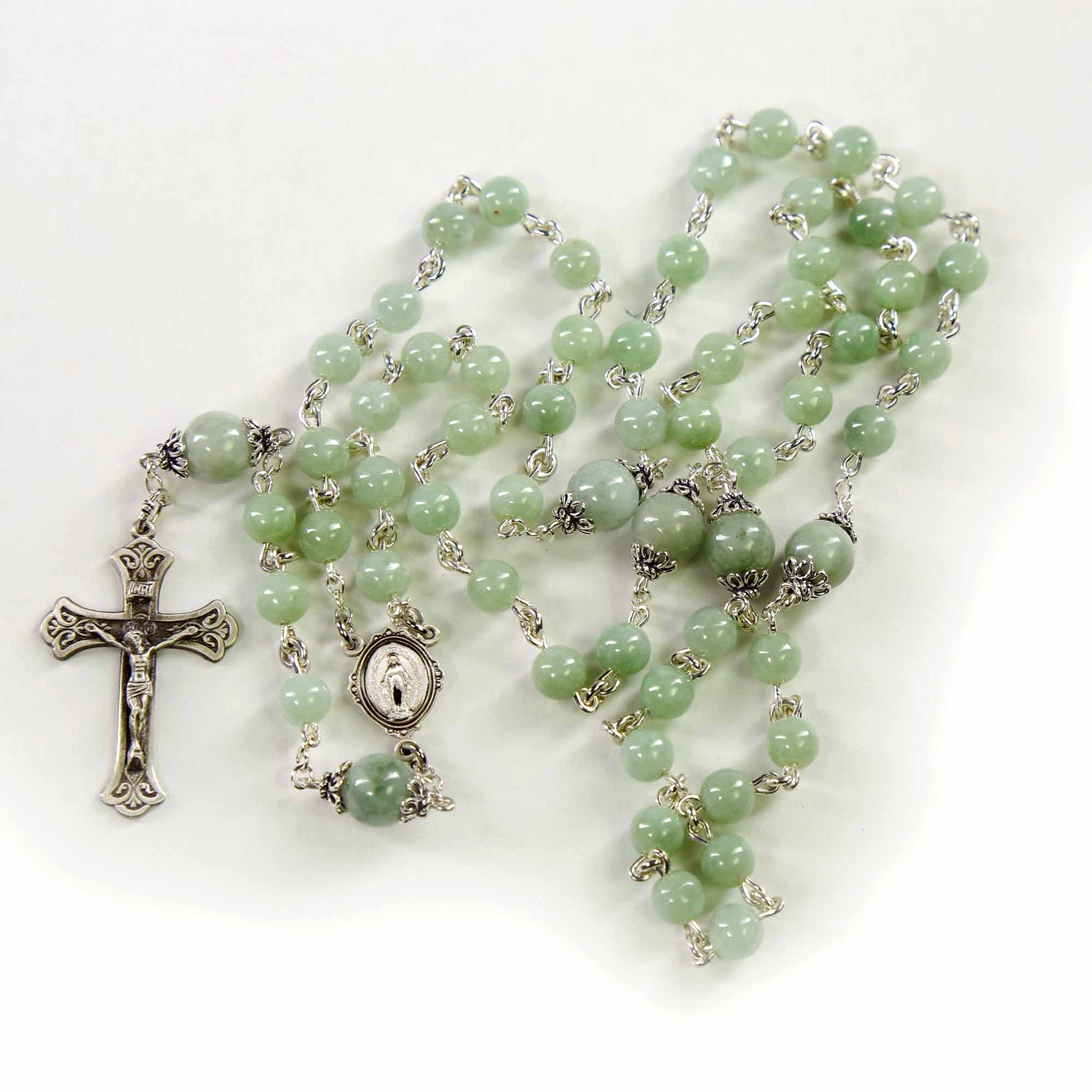 This Dainty Catholic Jade Rosary is handmade with 6mm Hail Marys and 8mm Our Fathers. The Our Fathers are encased with Dainty, Sterling Silver bead caps. It carries a Delicate Miraculous Medal center and a 1 1/2" Crucifix. SKU# 590