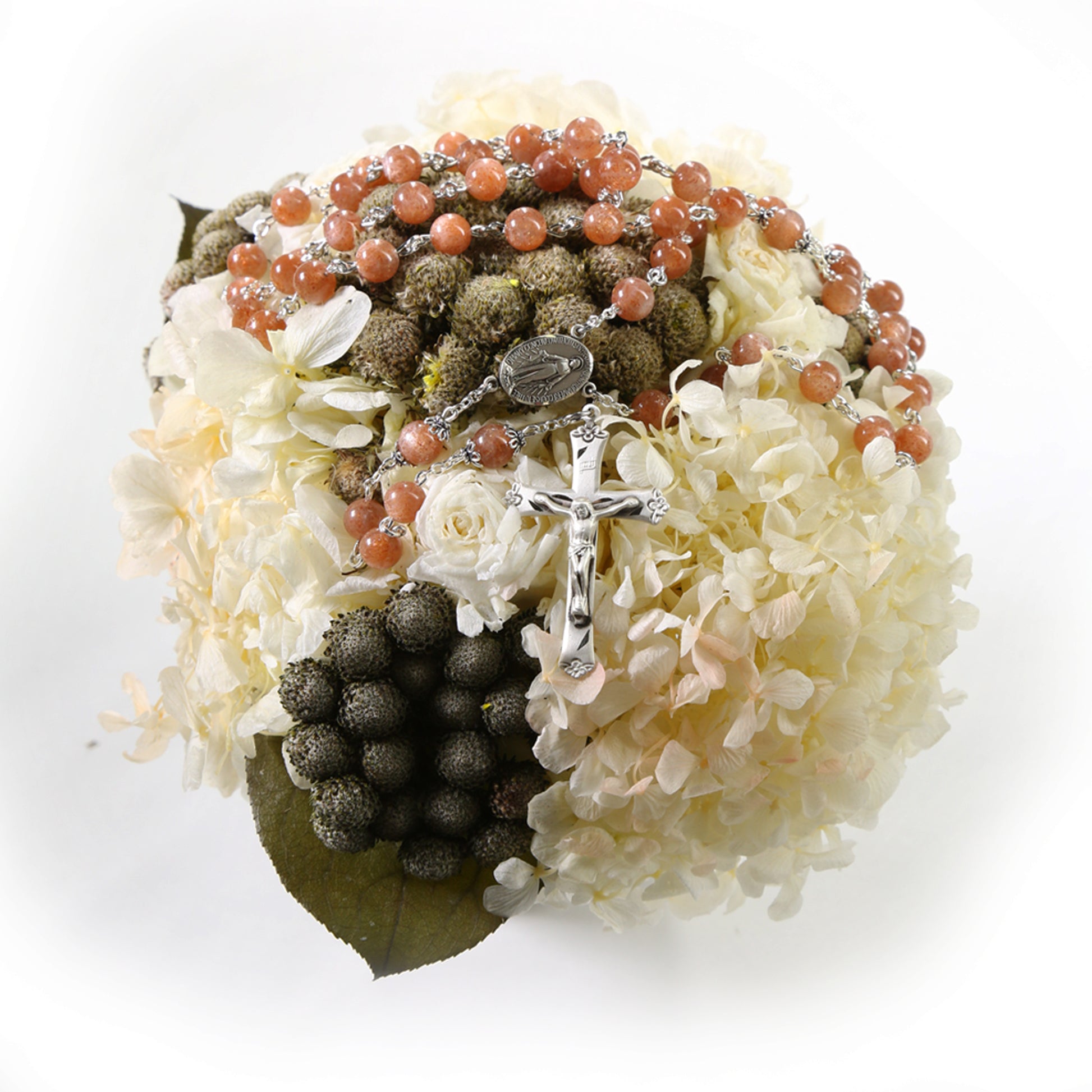 This stunning Rosary is one of my new favorites. The Orange Sunstone Beads have an almost peach glisten that shines and sparkles with every angle you see it from. The Hail Marys are 8mm Sunstone Beads with 10mm Our Fathers that are encased in Sterling Silver bead caps. The center is the Miraculous Mother & I gave it a wonderful 2 ¼ inch crucifix that can be engraved. #15